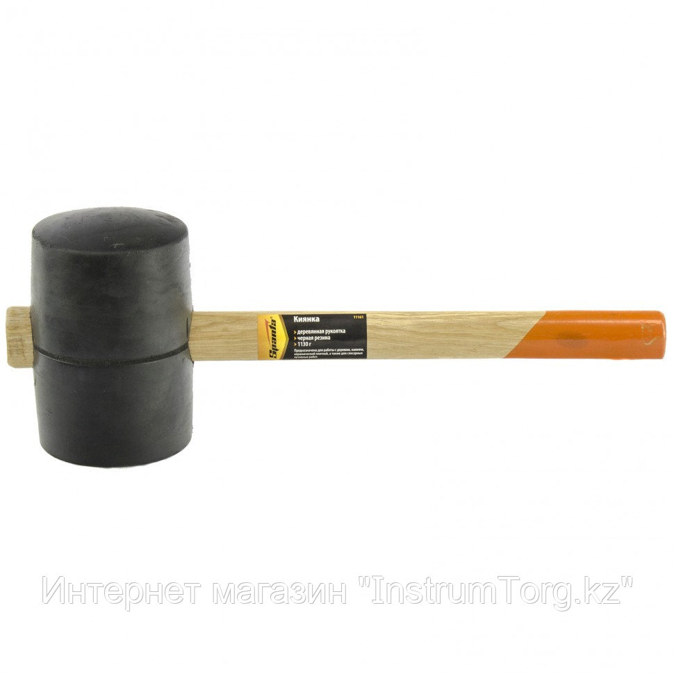 Киянка с головкой из черной резины твердостью 80 ед. по Шору А. От традиционной конструкции инструмент отличается креплением бойка «на протяг». Двухцветная рукоятка, изготовленная из древесины, защищена от рассыхания бесцветным лаком.