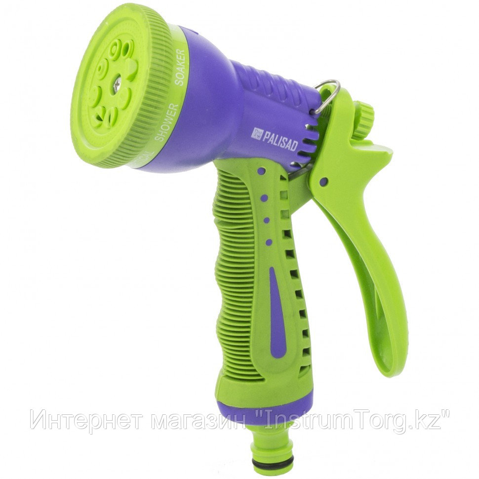 Пистолет-распылитель со штуцерной посадкой и курком, расположенным сзади. Оснащен регулируемой форсункой, что обеспечивает шесть режимов полива: душ, туман, конусную струю, центральную струю, плоско-горизонтальную струю, жесткую струю. Имеет фиксатор курка для непрерывной работы. Предназначен для всех типов полива на дачных участках, в садах, парках и скверах, а также для очистки. Совместим со всеми элементами системы полива PALISAD и PALISAD Luxe. Корпус и курок пистолета изготовлены из прочного АБС-пластика, рукоятка залита резиной, что обеспечивает максимальный комфорт при работе с инструментом.